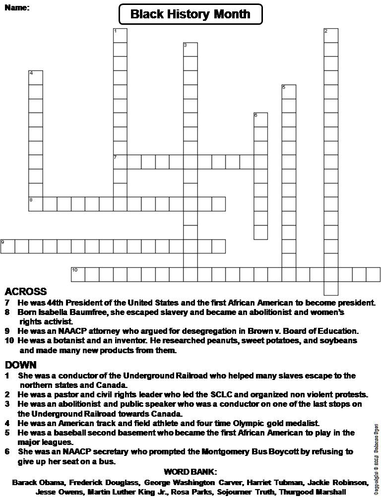 Black History Crossword Puzzle Free Printable for Kids and ... The Black History is American History Crossword Puzzle features 18 clues to be able to fill in the puzzle. Many of these may be facts that the students have already learned if you have been covering black leaders, authors, inventors, and more while learning about American History.